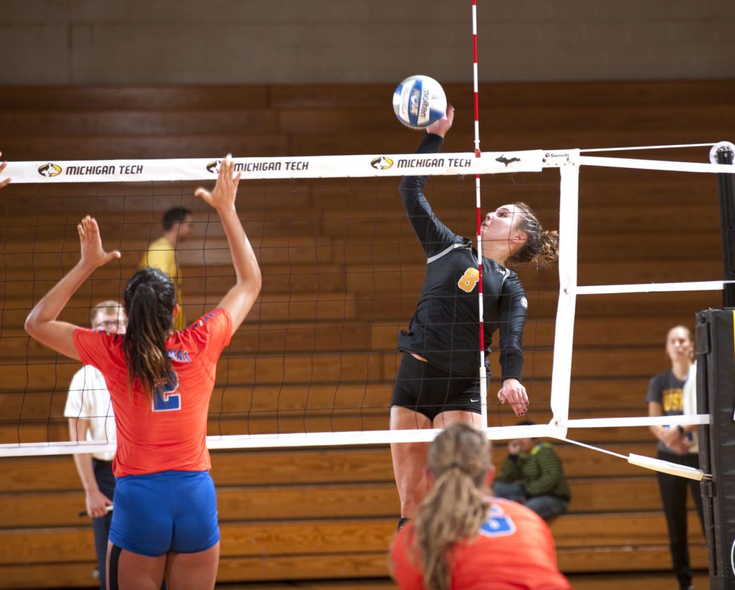David Archambeau/Daily Mining Gazette Michigan Tech’s MacAuley Petersen goes for a hit Thursday during the Keweenaw Classic against Mary at the Wood Gym.