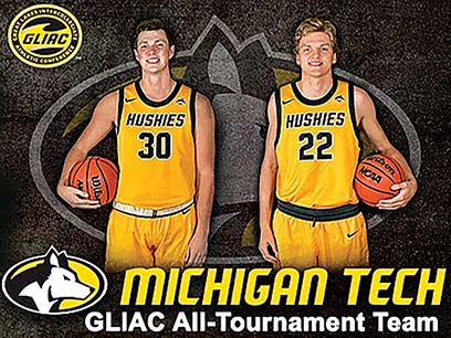 Photo courtesy of Michigan Tech Athletics Michigan Tech’s Kyle Monroe (30) and Owen White (22) were both named to the GLIAC All-Tournament Team after the Huskies won the GLIAC Tournament title Sunday.
