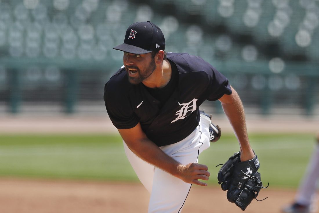 Detroit Tigers pitcher Michael Fulmer throws during an intrasquad baseball game, Wednesday, July 8, 2020, in Detroit. (AP Photo/Carlos Osorio)