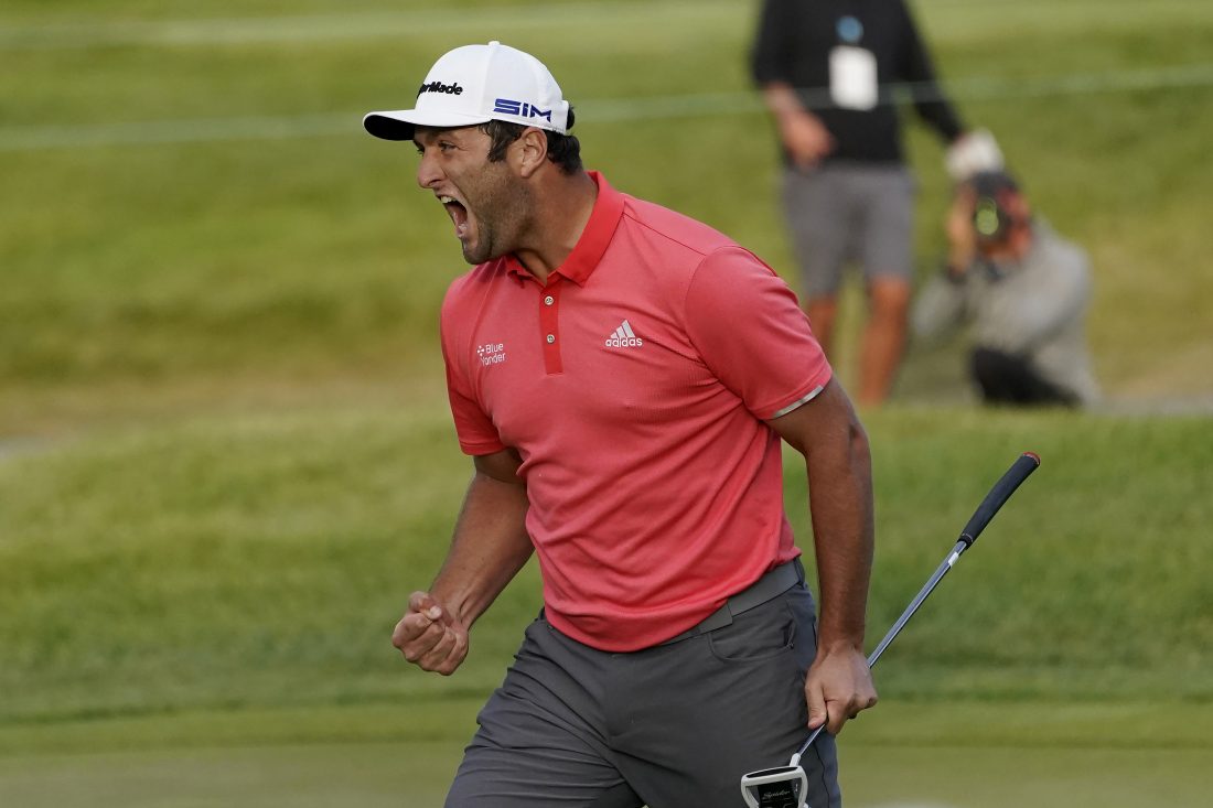 From one end of the 18th green to the other, Rahm’s putt from just over 65 feet rolled down the ridge and into the cup, setting off a roar so loud it nearly made up for not having spectators.