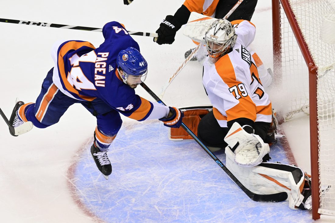 Philadelphia Flyers goaltender Carter Hart (79) stops New York Islanders center Jean-Gabriel Pageau (44) during overtime period NHL Stanley Cup Eastern Conference playoff hockey game action in Toronto, Thursday, Sept. 3, 2020. (Frank Gunn/The Canadian Press via AP)