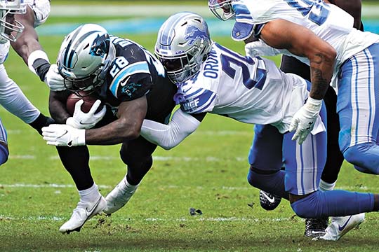 Gerry Broome/AP Photo Panthers running back Mike Davis is tackled by Lions cornerback Amani Oruwariye during the second half of a game Sunday in Charlotte, N.C.