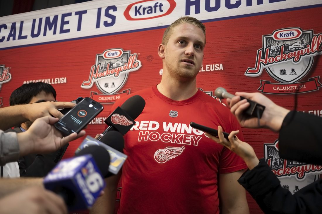 Detroit Red Wings forward Anthony Mantha speaks with the media after a preseason NHL game against the St. Louis Blues on Thursday, Sept. 26, 2019, in Calumet, Mich. The Red Wings and Blues played in a Kraft Hockeyville preseason exhibition game at the Calumet Colosseum, built in 1913 and the world's oldest continuously used ice arena in the world. (Adam Niemi/The Daily Mining Gazette)