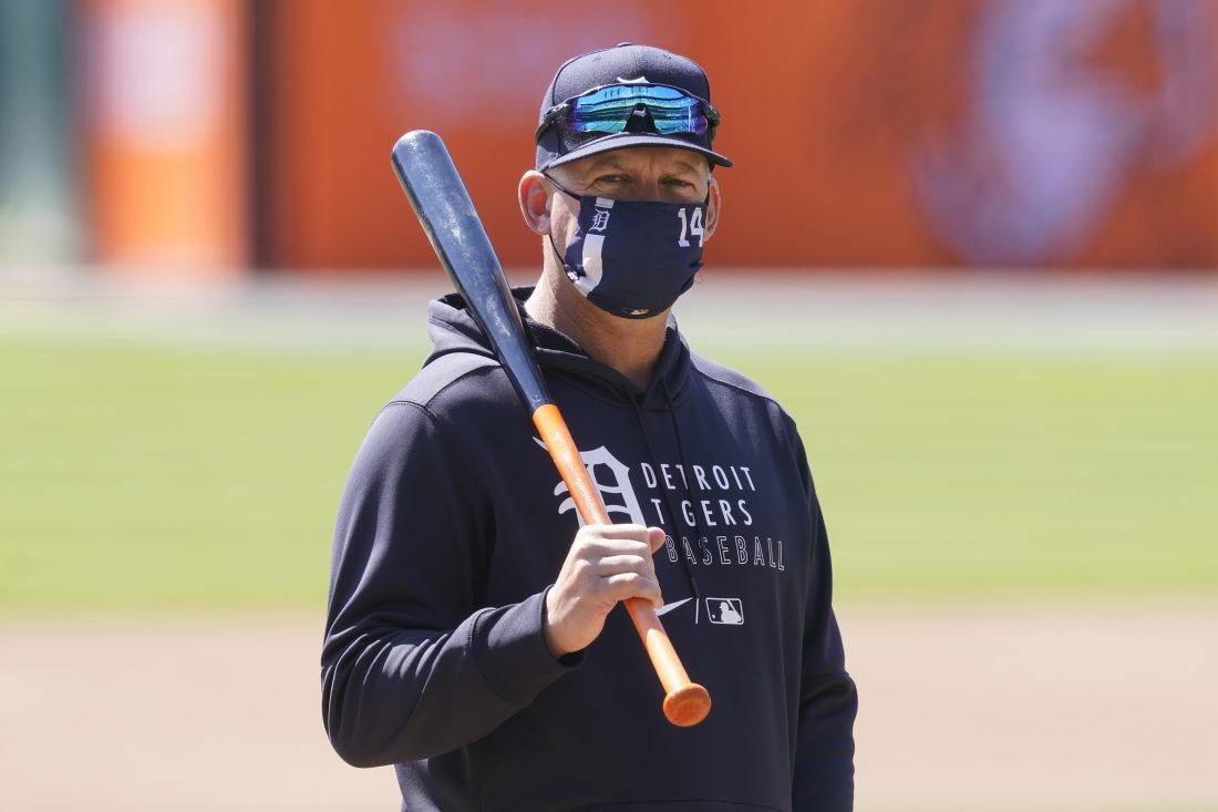 Detroit Tigers manager A.J. Hinch observes the practice session at Comerica Park, Wednesday, March 31, 2021, in Detroit. The Tigers home opener is Thursday against the Cleveland Indians. (AP Photo/Carlos Osorio)
