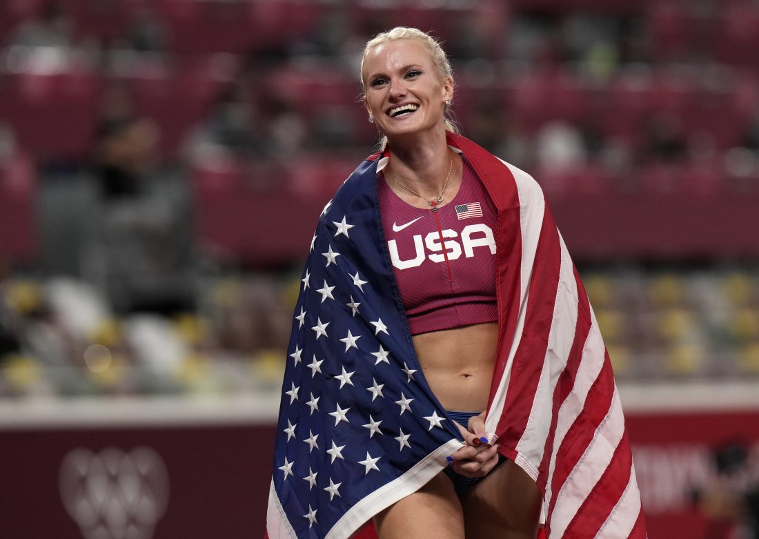Gold medalist Katie Nageotte celebrates after winning the final of the women's pole vault at the 2020 Summer Olympics, Thursday, Aug. 5, 2021, in Tokyo.(AP Photo/Francisco Seco)