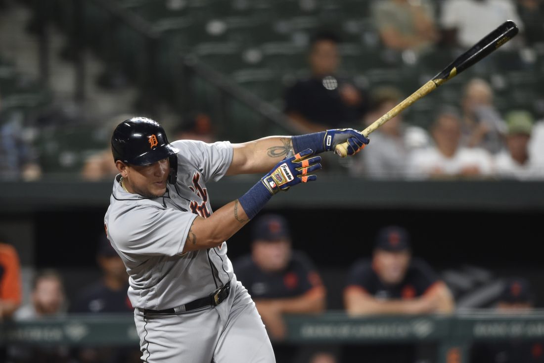 Detroit Tigers' Miguel Cabrera follows through on a single against the Baltimore Orioles in the third inning of a baseball game, Tuesday, Aug. 10, 2021 in Baltimore. (AP Photo/Gail Burton)