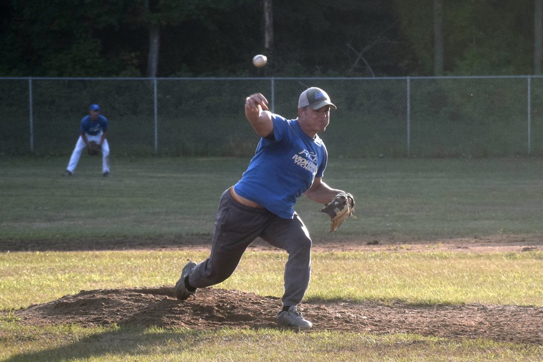 REL Inc.-MT pitcher Brian Halonen throws against Houghton Building Supply-Stanton on Tuesday, Aug. 10, 2021, in Stanton, Mich. (Eddie O’Neill/The Daily Mining Gazette)