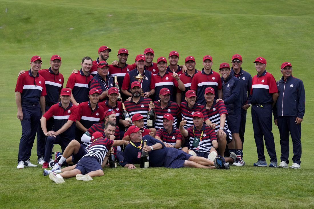 Victorious Team USA poses for a picture after the Ryder Cup matches at the Whistling Straits Golf Course Sunday, Sept. 26, 2021, in Sheboygan, Wis. (AP Photo/Ashley Landis)