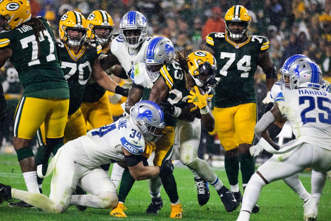 Green Bay Packers running back Aaron Jones (33) is tackled by Detroit Lions linebackers Alex Anzalone (34) and Jamie Collins Jr. (8) during an NFL football game on Monday, Sept. 20, 2021, in Green Bay, Wis. (Adam Niemi/The Daily Mining Gazette)