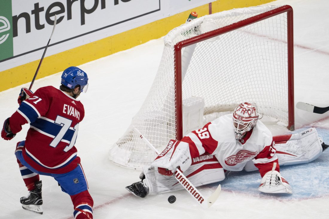 Montreal Canadiens Jake Evans (71) is stopped by Detroit Red Wings goaltender Alex Nedeljkovic (39) during the first period of an NHL hockey game Tuesday, Nov. 2, 2021, in Montreal. (Ryan Remiorz/The Canadian Press via AP)