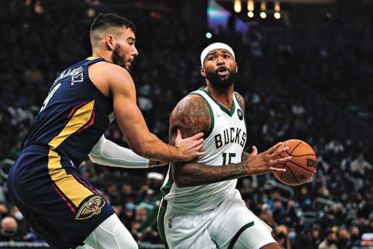 Morry Gash/AP Photo The Bucks’ DeMarcus Cousins tries to drive past the Pelicans’ Willy Hernangomez during the first half of a game Saturday in Milwaukee.