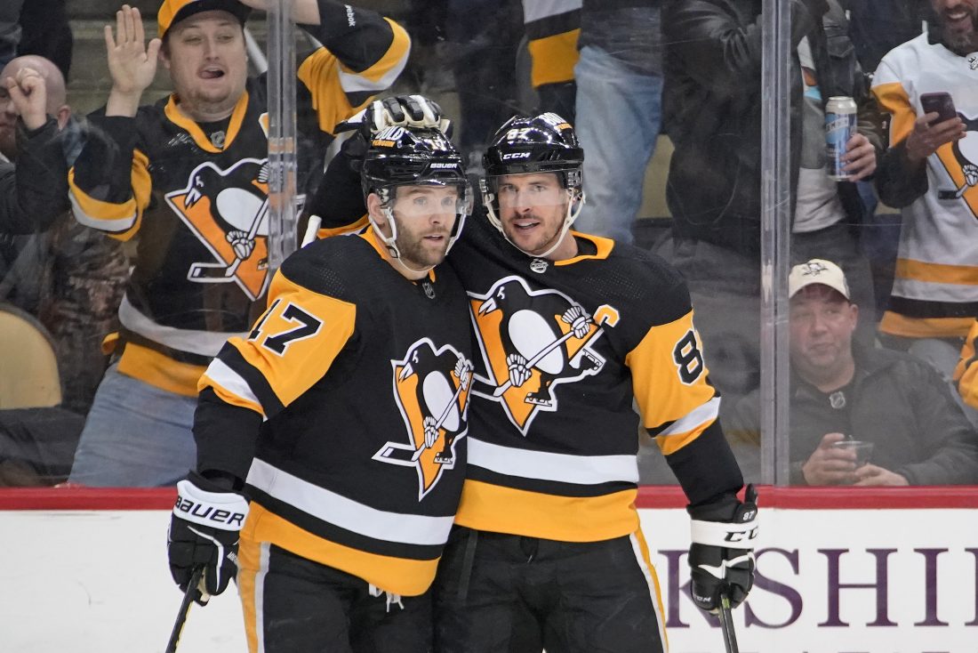 Pittsburgh Penguins' Sidney Crosby (87) celebrates his goal against the Ottawa Senators with Bryan Rust during the second period of an NHL hockey game in Pittsburgh, Thursday, Jan. 20, 2022. (AP Photo/Gene J. Puskar)