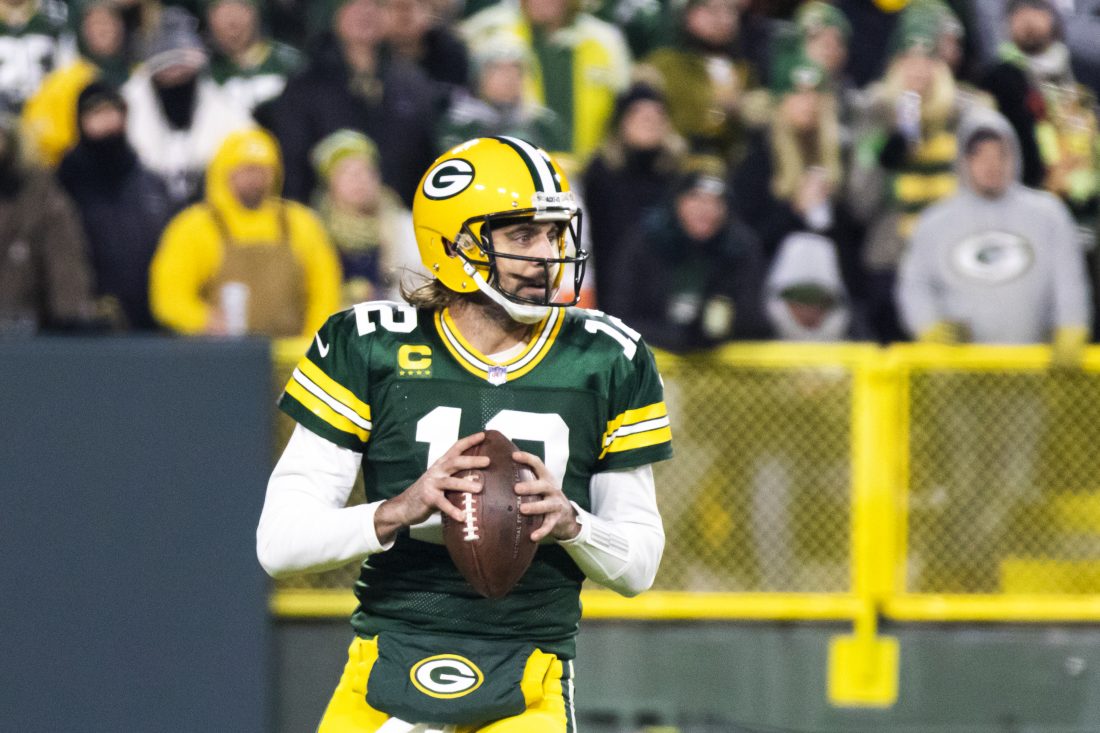 Green Bay Packers quarterback Aaron Rodgers (12) looks to pass against the Chicago Bears during an NFL football game on Sunday, Dec. 12, 2021, in Green Bay, Wis. (Adam Niemi/The Daily Mining Gazette)