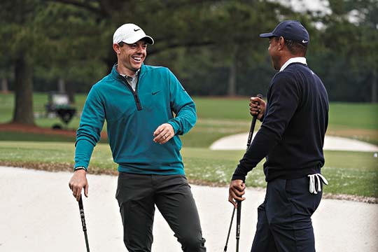 Charlie Riedel/AP Photo Tiger Woods is greeted by Rory McIlroy, of Northern Ireland during a practice round for the Masters golf tournament on Tuesday in Augusta, Ga.