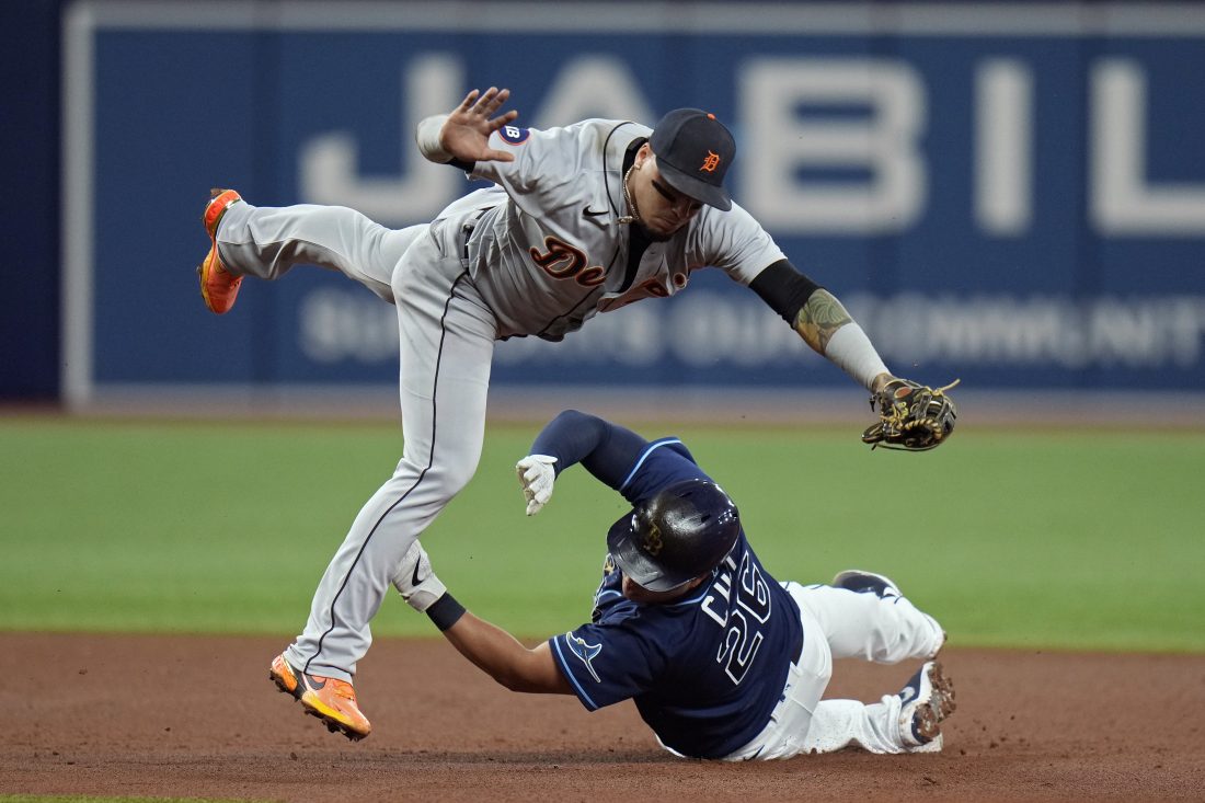 Tampa Bay Rays' Ji-Man Choi upends Detroit Tigers shortstop Javier Baez after being forced at second base on a fielder's choice by Randy Arozarena during the fourth inning of a baseball game Tuesday, May 17, 2022, in St. Petersburg, Fla. (AP Photo/Chris O'Meara)