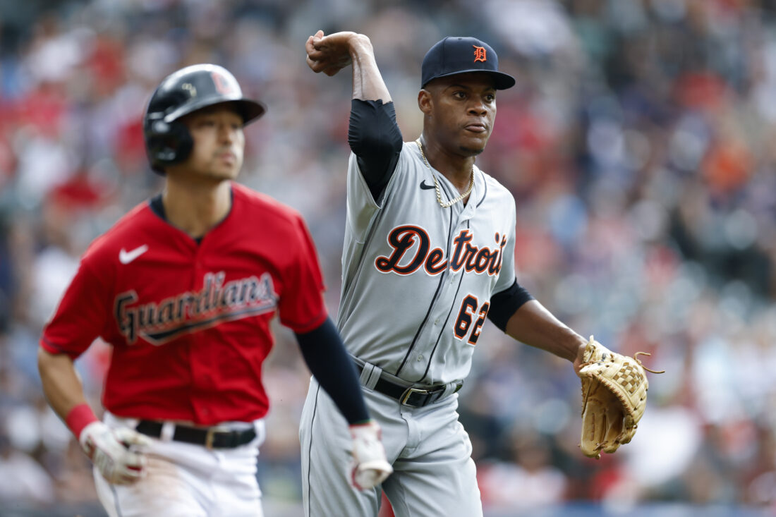 Detroit Tigers relief pitcher Angel De Jesus throws out Cleveland Guardians' Steven Kwan at first base during the third inning of a baseball game Saturday, July 16, 2022, in Cleveland. (AP Photo/Ron Schwane)