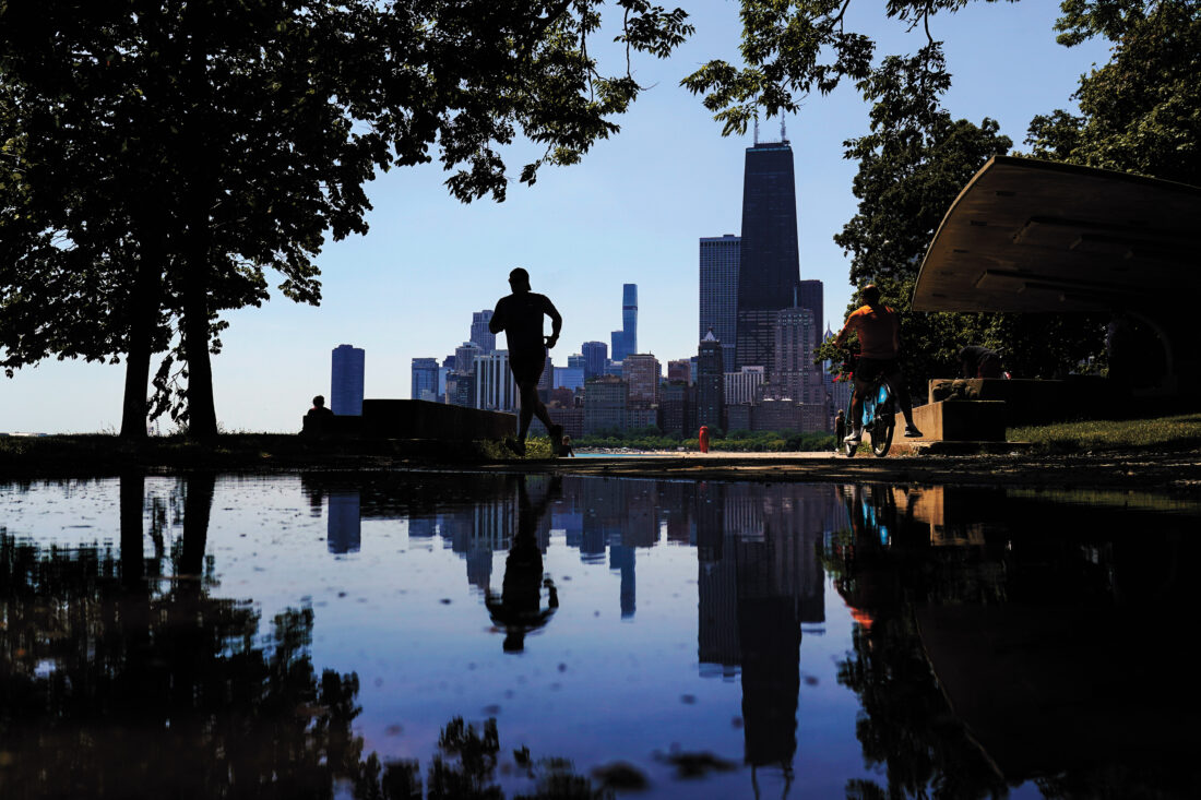 A runner jogs along a path on the shore of Lake Michigan as the downtown skyline is seen in the background, Tuesday, July 19, 2022, in Chicago. (AP Photo/Kiichiro Sato)