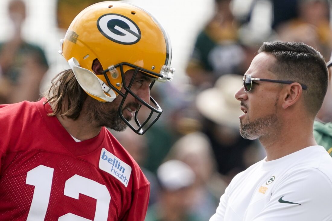 Green Bay Packers' Aaron Rodgers talks to head coach Matt LaFleur at the NFL football team's practice field Wednesday, July 27, 2022, in Green Bay, Wis. (AP Photo/Morry Gash)