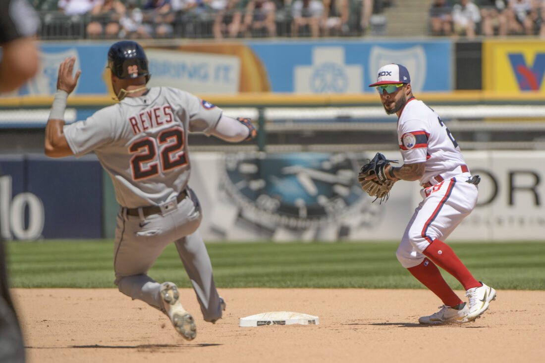 Chicago White Sox shortstop Leury Garcia turns the double play on Detroit Tigers' Victor Reyes (22) during the fifth inning of a baseball game, Sunday, July 10, 2022, in Chicago. (AP Photo/Mark Black)