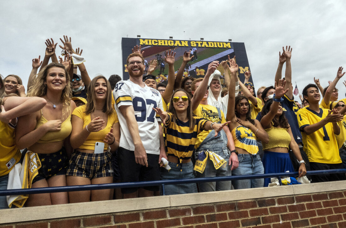 FILE - Michigan fans in the student section cheer during the second quarter of an NCAA college football game against Western Michigan at Michigan Stadium in Ann Arbor, Mich., on Sept. 4, 2021. The Big Ten announced Thursday, Aug. 18, 2022, that it has reached seven-year agreements with Fox, CBS and NBC to share the rights to the conference's football and basketball games. (AP Photo/Tony Ding, File)