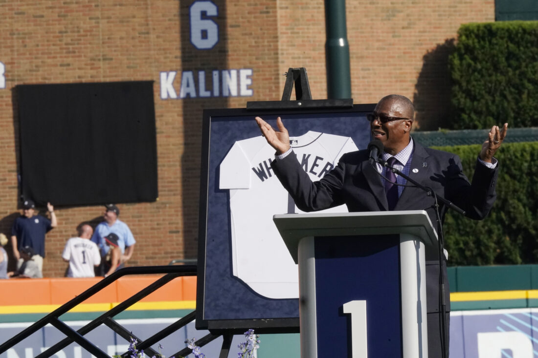 The game started about 20 minutes late because of the ceremony to honor Whitaker, whose name and number are now displayed in left-center field, just to the right of long-time double-play partner Alan Trammell’s No. 3.