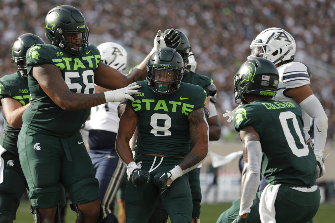Michigan State's Jalen Berger, center, Spencer Brown, left, and Keon Coleman (0) celebrate Berger's rushing touchdown against Akron during the second quarter of an NCAA college football game, Saturday, Sept. 10, 2022, in East Lansing, Mich. (AP Photo/Al Goldis)