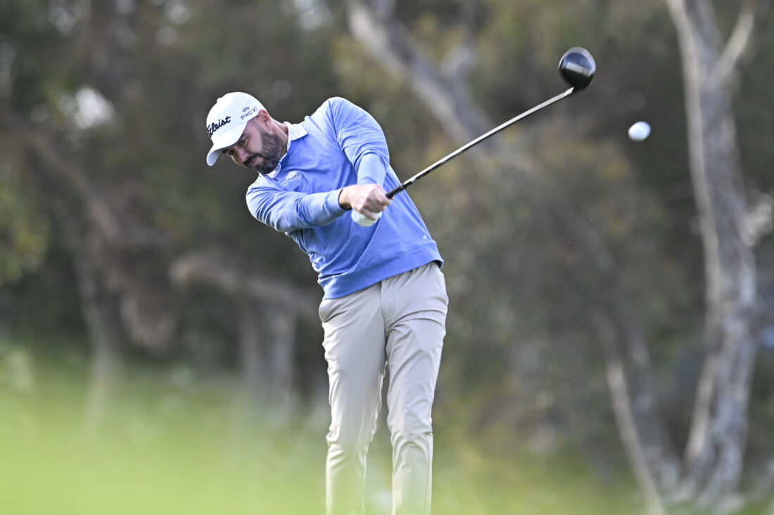 FILE - Troy Merritt hits his tee shot on the seventh hole of the North Course at Torrey Pines during the first round of the Farmers Insurance Open golf tournament, Jan. 22, 2025, in San Diego. (AP Photo/Denis Poroy, file)