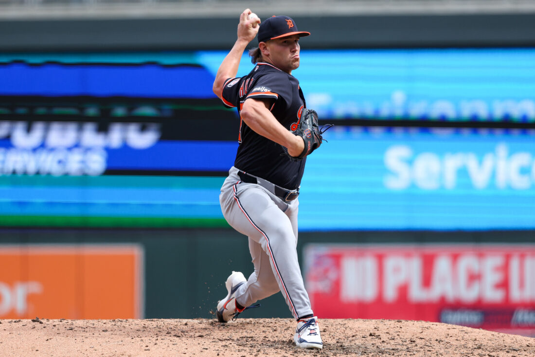 Detroit Tigers pitcher Tyler Holton delivers against the Minnesota Twins during the seventh inning of baseball game, Thursday, April 9, 2026, in Minneapolis. (AP Photo/Matt Krohn)