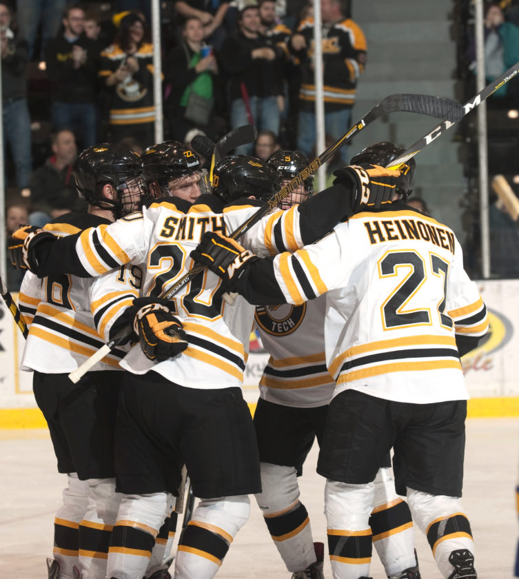 David Archambeau/Daily Mining Gazette Michigan Tech celebrates a goal against Lake Superior State at the MacInnes Student Ice Arena on Nov. 12.