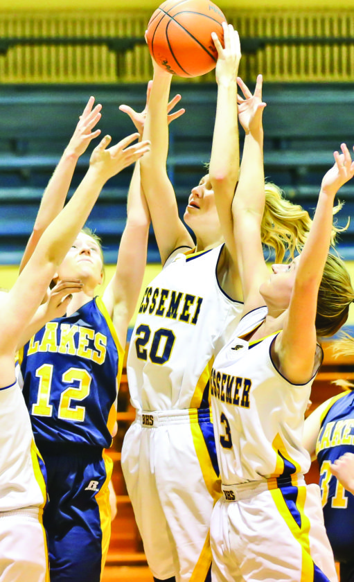 Jason Juno/Daily Globe Bessemer's Caitlin Lynch (20) grabs a rebound as teammate Megan Peterson (3) and Lake Linden-Hubbell's Erin Seppala (12) also reach for it during Tuesday night's game at the House of Noise in Bessemer.