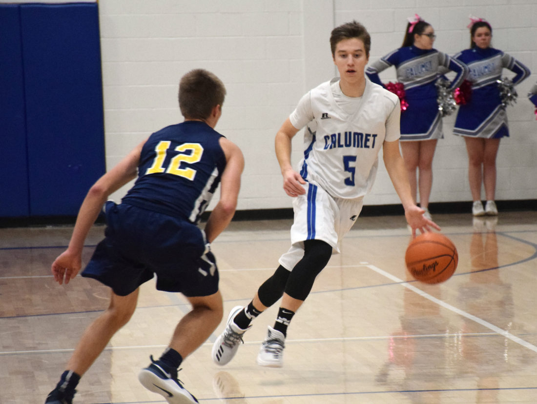 Daver Karnosky/Daily Mining Gazette Calumet's Wyatt Loukus looks for open floor while attempting to find a way around Chassell's Hunter Rautiola during the first quarter of a game Tuesday at the Calumet Gym.