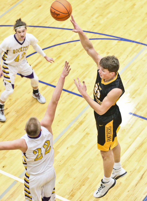 Jason Juno/Daily Globe (Ironwood) Ewen-Trout Creek’s Jake Witt shoots against Rapid River on March 20 at Lakeview Memorial Gymnasium in Negaunee.