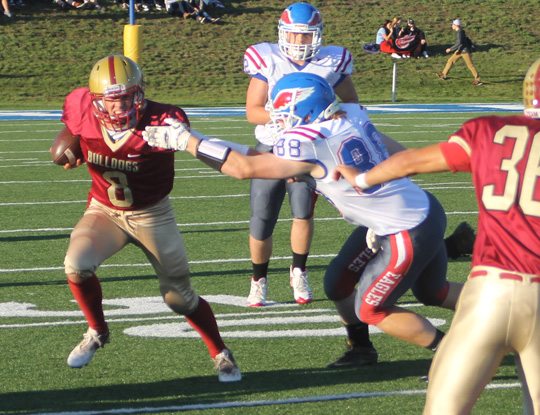 Paul Peterson photo Hancock quarterback Colton Salani scrambles for yardage in the first half of Friday night's game versus as Bryce Lederer of the Eagles defends. The unbeaten Bulldogs scored a 48-20 win.