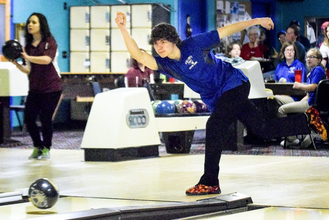 Calumet’s Jordan Kesanen bowls Saturday, at Miller’s Recreation in Laurium. (Bryce Derouin/Daily Mining Gazette)