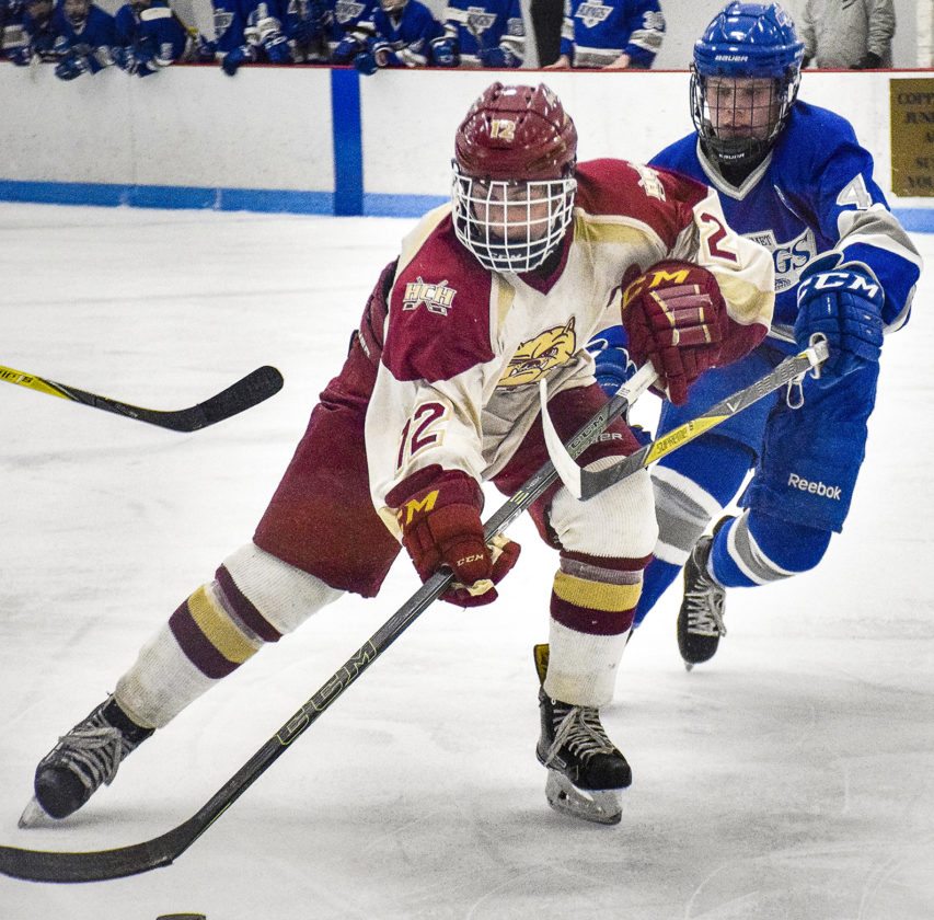 Hancock’s Teddy Randell heads up the ice as Calumet’s Brent Loukus gives chase Tuesday in Hancock. (Eden Laase/Daily Mining Gazette)