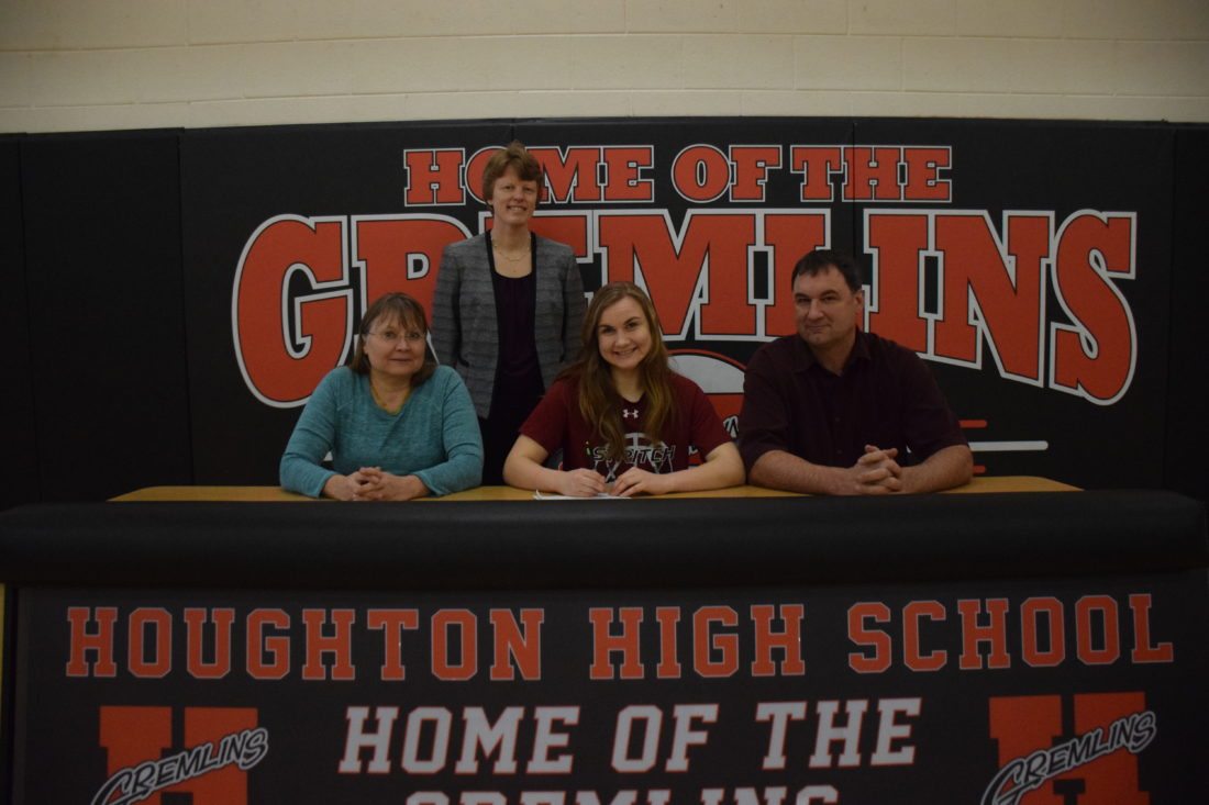 Houghton’s Madi Dillinger signed her letter of intent to play basketball at Cardinal Stritch University Thursday in Houghton. Accompanying Dillinger was her parents, Ken and Robin, and coach Julie Filpus.