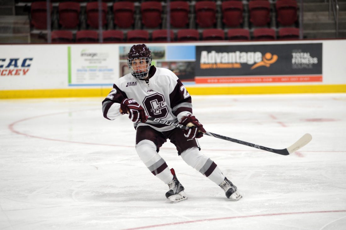 Raiders defenseman Chelsea Jacques sets to transition up the ice during a game this past season at the Class of 1965 Arena in Hamilton, New York. (Colgate Athletics photo)