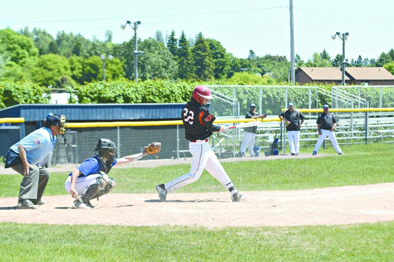 Daver Karnosky/Daily Mining Gazette The Flames’ Logan Fish connects with a pitch from the Blues’ Alec Gadzinski during the seventh inning of the first game of a doubleheader Sunday at the Hancock Driving Park.