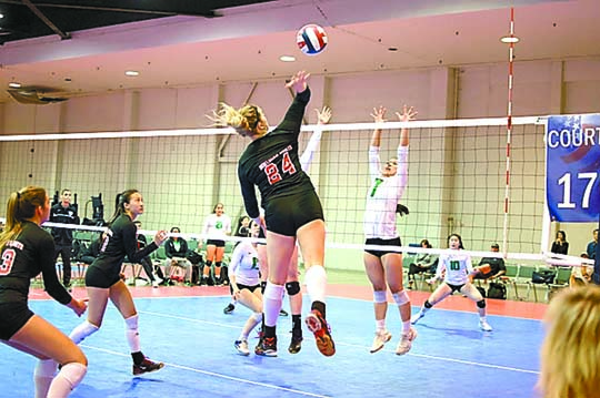 Photo submitted to the Daily Minini Gazette Northern Lights middle blocker Janie Grindland jumps up for a spike during an Amateur Athletic Union match during the 2017 season.
