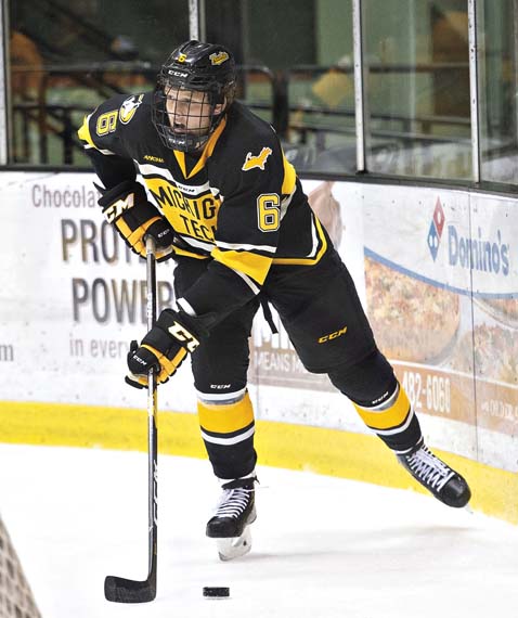 Dave Archambeau/Daily Mining Gazette Michigan Tech’s Coeper Watson controls the puck behind his own net during the Black and Gold game Saturday at the MacInnes Student Ice Arena.