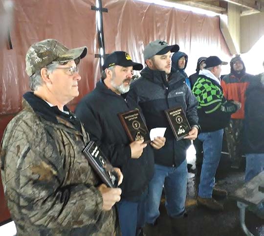 Skip Schulz/For the Gazette Taking first place at this weekend’s Aspirus Ontonagon Lake Trout Classic (from left), Wayne Giesau, Paul Luokka, Aaron Dean.