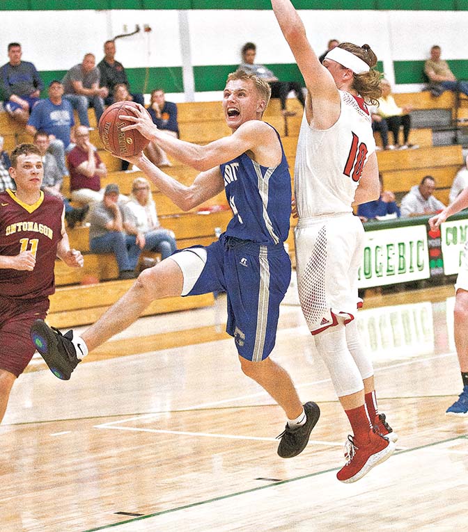 Jason Juno/Daily Globe (Ironwood) Calumet’s Matt Ojala of Northern Michigan attacks the basket Wednesday during the Kiwanis Classic Border Bash at the Lindquist Center in Ironwood.