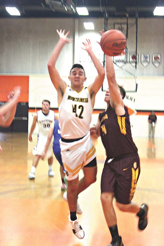 Dennis Grall/Daily Press (Escanaba) Eddy Polakowski of Ontonagon brushes a shot away by Iron Mountain’s Jaden Vicenzi Saturday in the 34th annual U.P. All-Star Classic in Newberry. Polakowski’s North team won 107-93. The North girls also won.