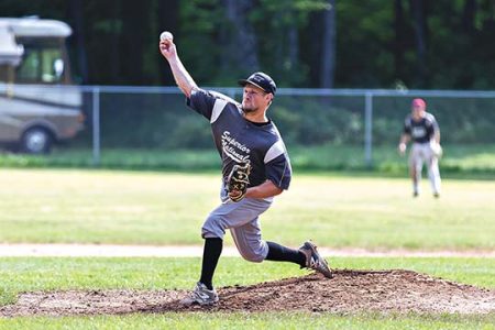 Superior National Bank-Stanton’s Tyler LaDuron pitches against REL Inc.-Mohawk Technologies in the Twilight League championship game on Sunday, Aug. 23, 2020, at Stanton Field in Stanton, Mich. (Adam Niemi/The Daily Mining Gazette)