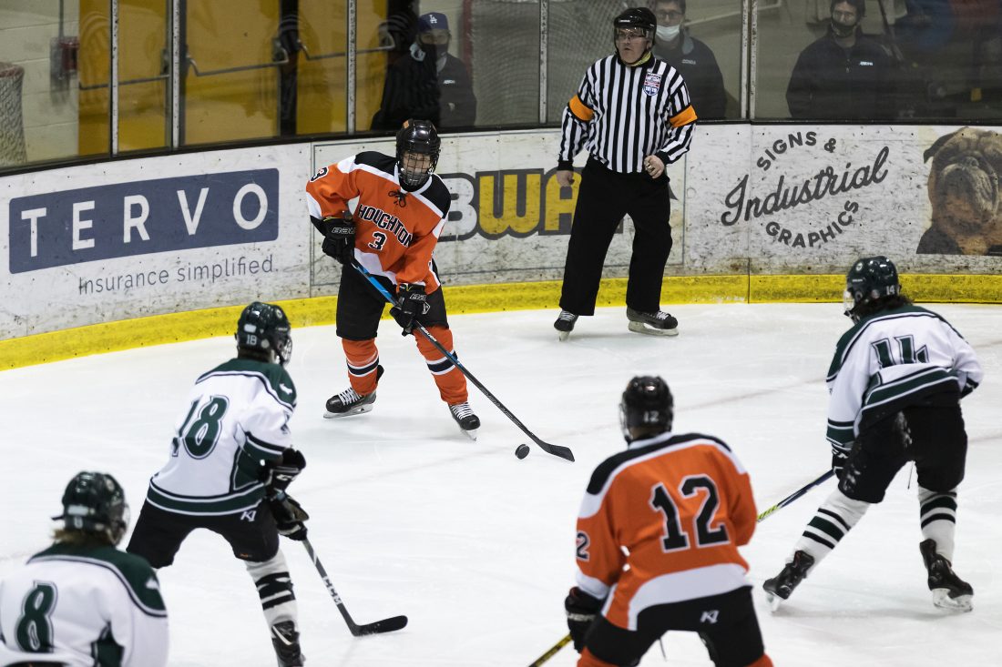 Houghton’s Evan Labyak (3) looks to pass to Brandon Norkol (12) as Jeffers’ Caden Hillstrom (18), Nathan Wakeham (14) and Brok Holombo (8) defend on Tuesday, Feb. 9, 2021 in Houghton, Mich. (Adam Niemi/The Daily Mining Gazette)