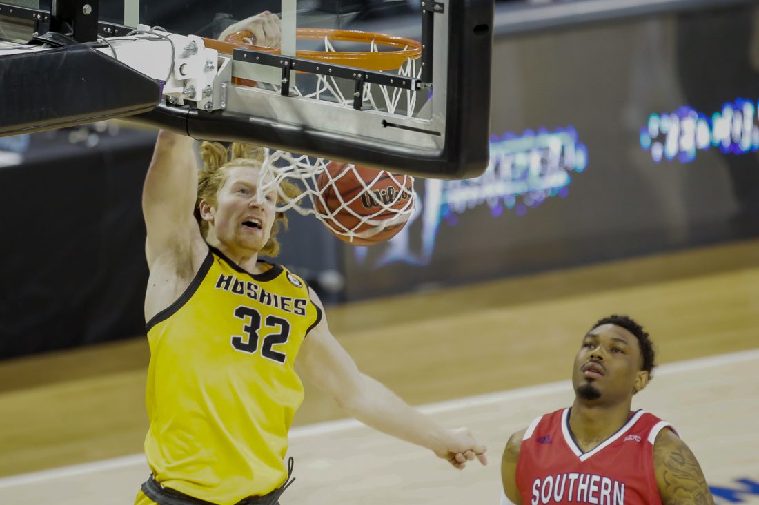 Michigan Tech senior Trent Bell slam dunks against Southern Indiana on Sunday, March 14, 2021 in Evansville, Ind. (Courtesy Photo/Kenneth May)