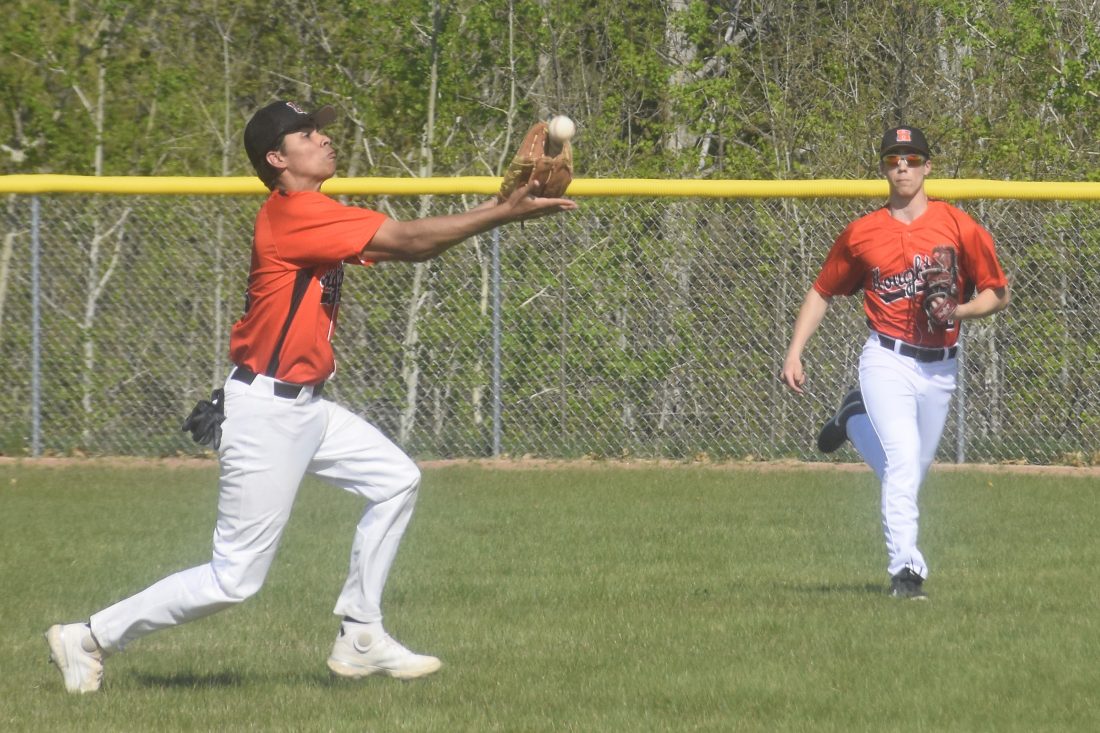 Houghton’s Gaborik Carlson, left, attempts to make a catch in front of teammate Bryce Pugh during a game against Marquette on Tuesday, May 18, 2021, in Houghton, Mich. (Eddie O’Neill/The Daily Mining Gazette)