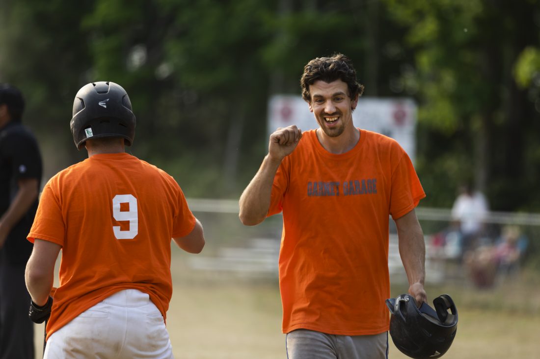 - Garnet Garage’s Chris Saari, right, celebrates with Brandon Norkol after scoring a run against Channing during the championship game of the 20th annual Leo Durocher Tournament on Sunday, July 11, 2021, at in Stanton, Mich. (Adam Niemi/The Daily Mining Gazette)
