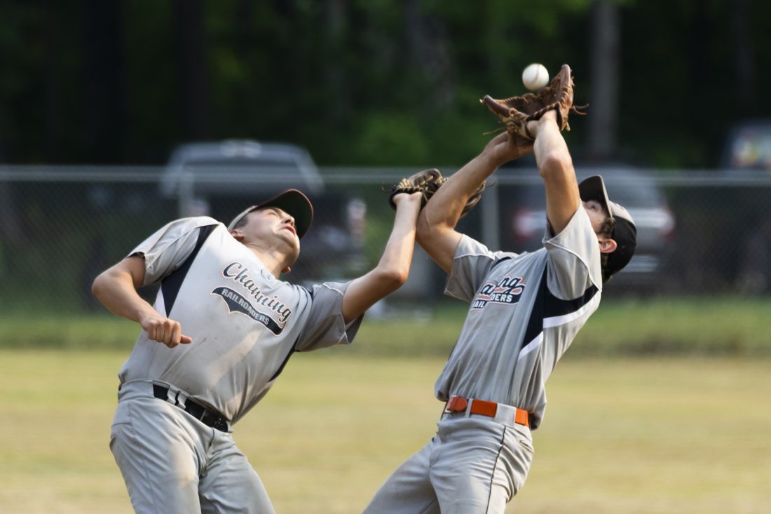 - Channing pitcher Noah Berg, right, catches a fly ball next to third baseman Matt Wiitanen against Garnet Garage during the championship game in the 20th annual Leo Durocher Tournament on Sunday, July 11, 2021, at in Stanton, Mich. (Adam Niemi/The Daily Mining Gazette)