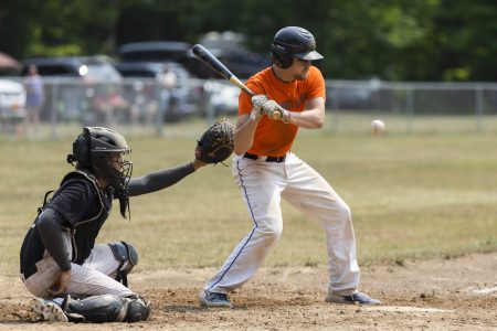 - Garnet Garage’s Gideon Scott, right, bats in front of Houghton Building Supply-Stanton catcher Kevin Bostwick during a semifinal game in the 20th annual Leo Durocher Tournament on Sunday, July 11, 2021, at in Stanton, Mich. (Adam Niemi/The Daily Mining Gazette)